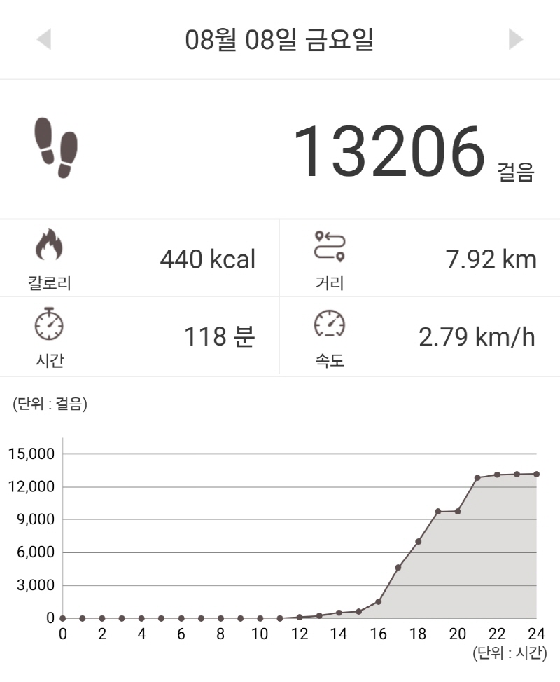 오늘은 7.92km에 13,206보를 걸었네요.