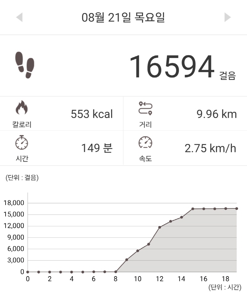 오늘은 9.96km에 16,594보를 걸었네요.