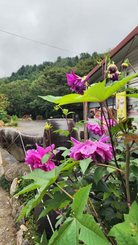 어느 식당 화단에 다알리아가 곱게 피어 있었습니다.