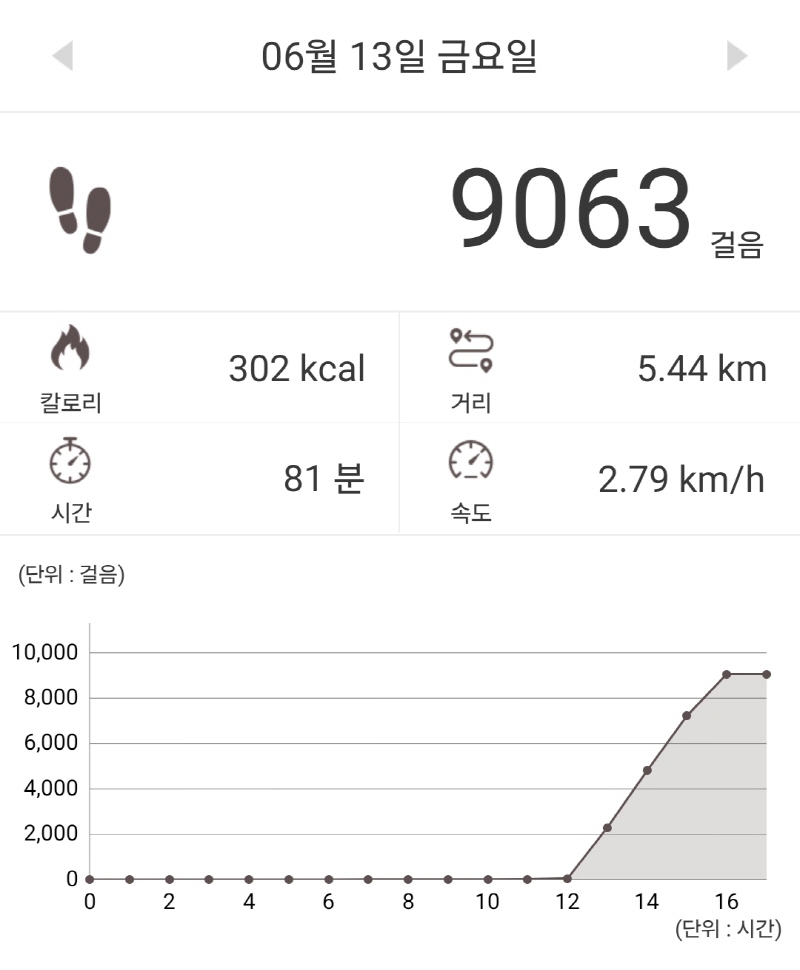 집으로 돌아 왔는데 오늘은 5.44km에 9,063보를 걸었네요.